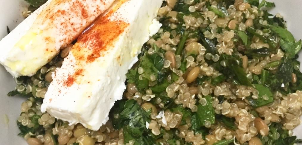 Boost the nutritive value by serving the quinoa and lentil tabbouleh on a bed of rocket with Halloumi laid out on top of the salad.