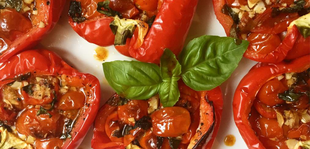 - Fill each pepper with halved cherry tomatoes, so that they are reasonably well packed.