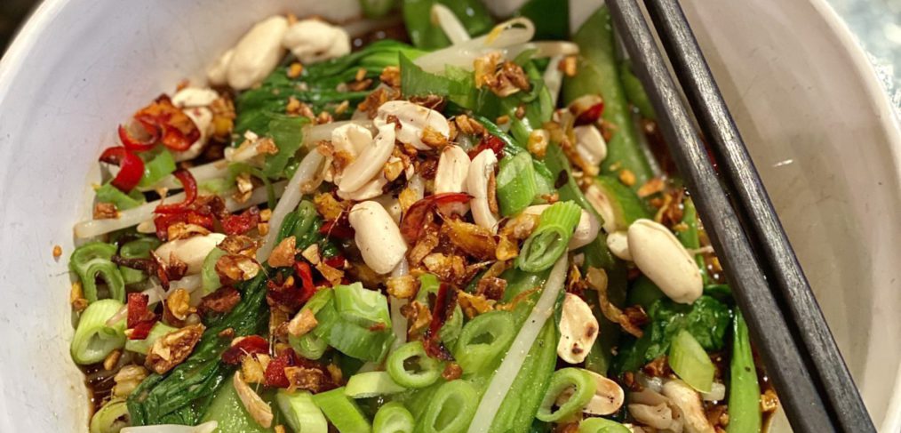 Top with the toasted peanuts and the crispy garlic/ginger/chilli mixture and finally garnish with the spring onions, coriander (if using) and a squeeze of lime.