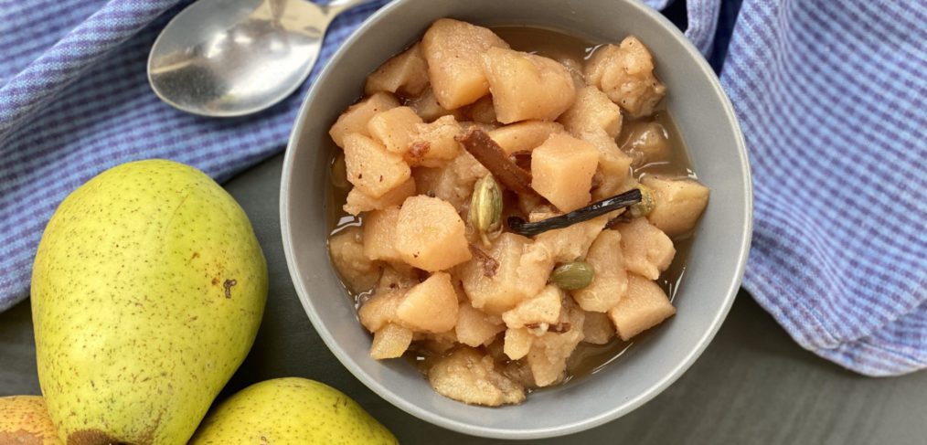 We may not always consider pears to make a compote, but as they are generally sweeter than the more traditional apples, they work well combined with spices for a delicious pear compote that you can keep in the fridge and use all week. You’ve then got a versatile dessert, pancake or porridge topping or simply with a dollop of natural yoghurt for a healthy dessert to finish off your meal. This recipe does of course work equally well using apples, or indeed a combination!