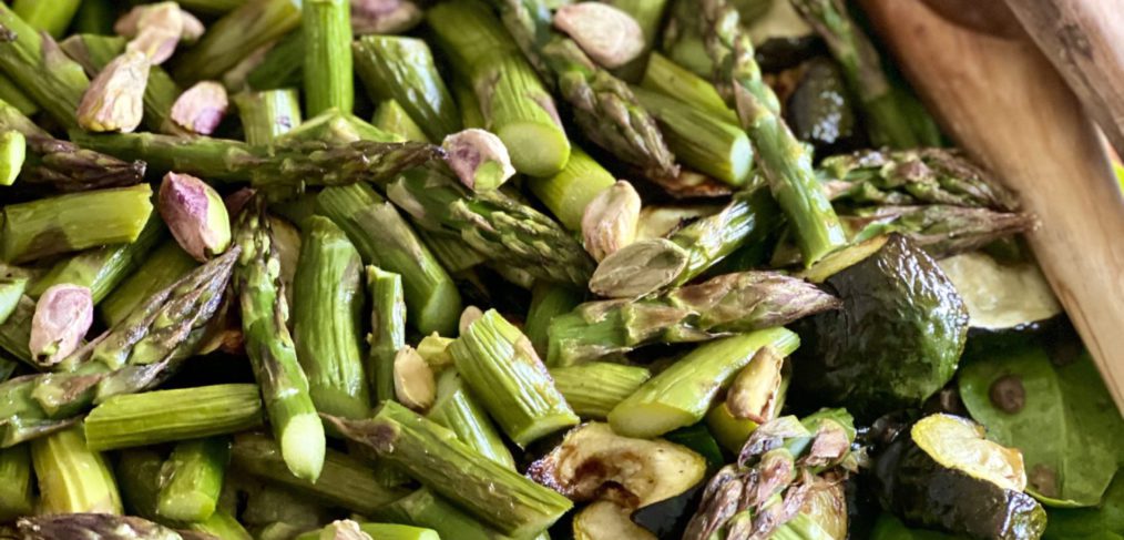 Now build your salad, starting with the pesto lentil and spinach base, adding a layer of the roasted courgettes, followed by the asparagus and finally top with the pistachio nuts.