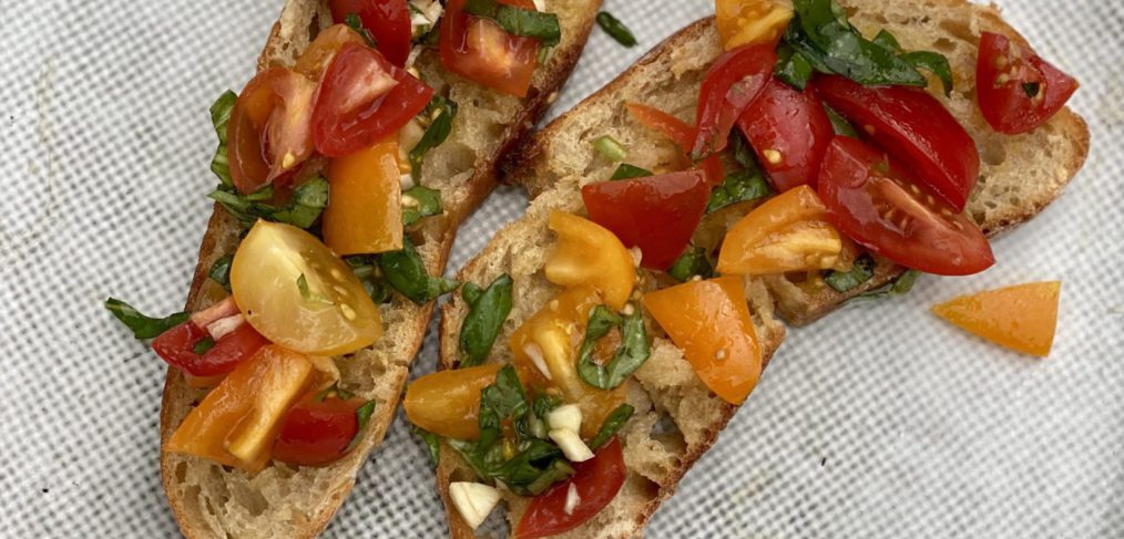 A classic Italian tomato Bruschetta (pronounced “brusketta”) with delicious marinated, fresh ripe tomatoes is one of the best ways to capture the flavours of summer. It couldn’t be easier to prepare and it’s also a great one to make ahead, so it’s ready to serve as soon as guests arrive as an appetizer or BBQ accompaniment. It’s also perfect to have in the fridge as a healthy topping for a weekday supper for weekend brunch.