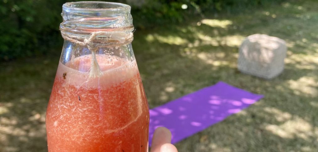 Nothing shouts summer more than Watermelon! This simple smoothie blends fresh, ½ small (very) cold watermelon with ginger (1 thumb size piece) and 1 lime (peeled and most of the white pith removed). That’s it!